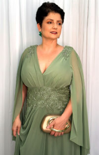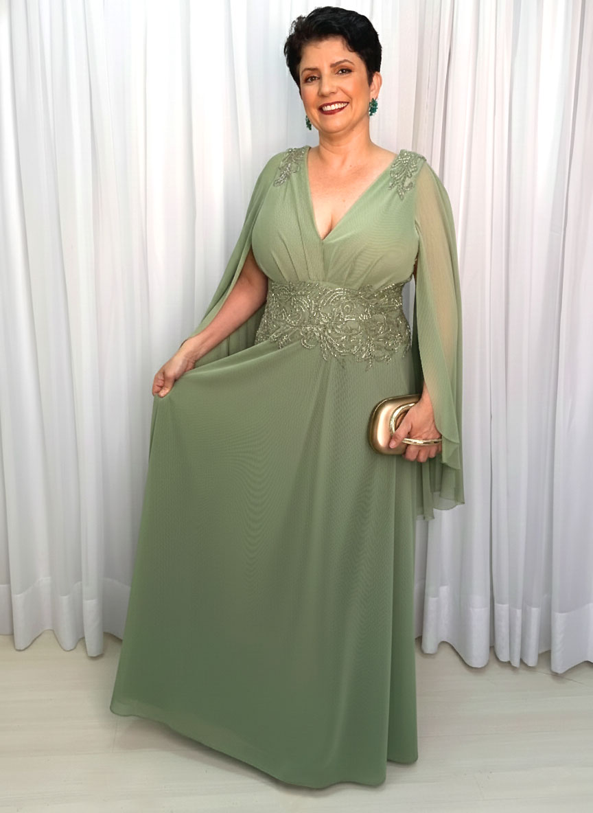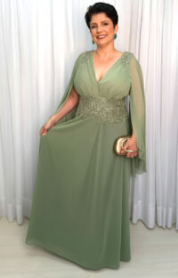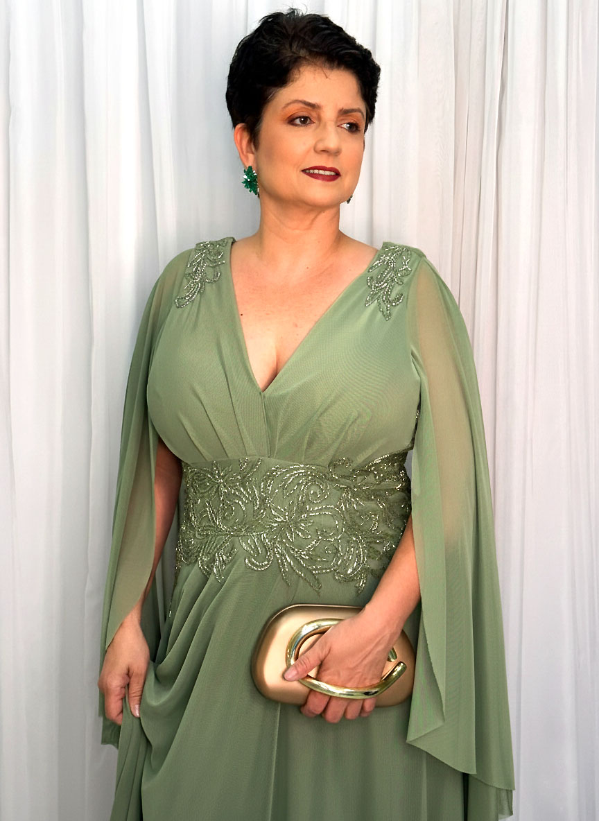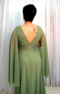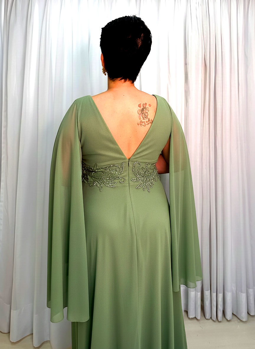 Vestido longo em tom verde oliva, com silhueta fluida evasê, confeccionado em tecido leve e delicado. Possui decote V frontal e posterior, mangas tipo capa esvoaçantes e aplicação bordada na cintura com pedrarias e arabescos florais, destacando a estrutura do busto e harmonizando a proporção da peça. Fechamento por zíper posterior embutido.