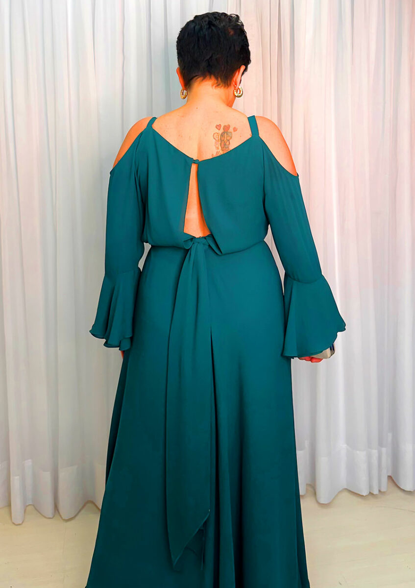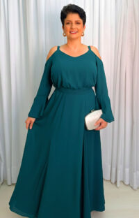 A paleta verde petróleo, combinada com o acabamento limpo e o caimento impecável, torna este vestido uma escolha altamente elegante para eventos que pedem presença marcante.