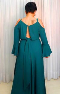 Este vestido longo em um elegante tom de verde petróleo combina suavidade e sofisticação em cada detalhe. Na parte frontal, o decote V delicado é sustentado por alças finas, enquanto o design de ombro a ombro deixa os ombros expostos de forma sutil e feminina. As mangas longas, com caimento solto e punhos amplos em leve babado, acrescentam um toque romântico ao visual.