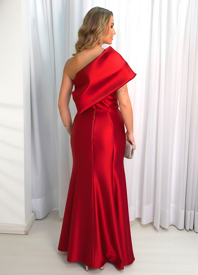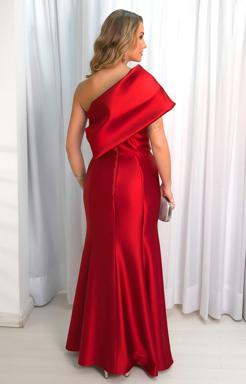 Vestido vermelho em zibeline estilo semi-sereia decote um ombro só aplicação floral estruturada e fenda