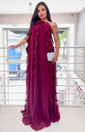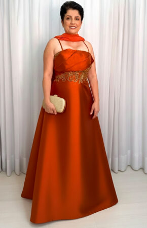 Vestido terracota estilo evasê decote coração com alcinhas finas bordado dourado na cintura e echarpe em chiffon