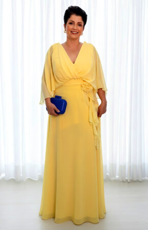 Vestido Amarelo semi sereia em zibeline com capa de musseline e aplicação floral 3D
