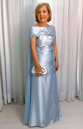 Vestido azul serenity evasê em zibeline decote ombro a ombro e bordados prateado