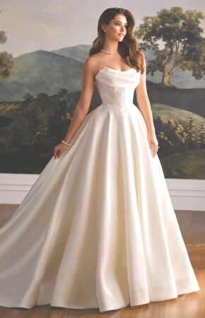 Vestido de noiva minimalista off white estilo princesa tomara que caia drapeado corpete estruturado saia ampla cauda longa