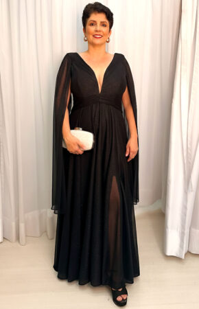 Vestido preto fluido estilo evasê decote V com fenda e capa