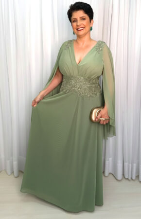 Vestido verde oliva fluido decote V manga capa e bordado na cintura