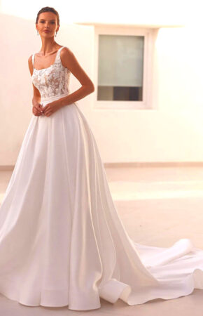 Vestido de noiva off white estilo godê decote quadrado corpete com aplicaçoes florais saia em zibeline mikado