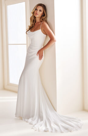 Vestido de noiva branco minimalista fluido estilo sereia decote drapeado e alças finas