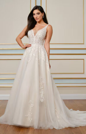 Vestido de noiva off white evasê decote em V estilo camiseta em tule e renda