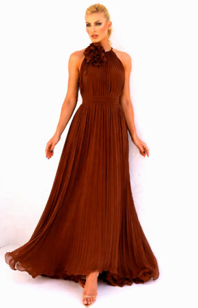 Vestido marrom fluido estilo evasê plissado gola americana aplicação Floral