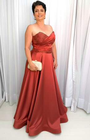 Vestido terracota em cetim italiano corpete estruturado, decote coração e saia evasê