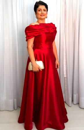Vestido vermelho intenso estilo evasê decote ombro a ombro com babados esculturais
