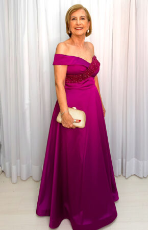 Vestido rosa fúcsia acetinado estilo godê ombro a ombro com bordado em pedrarias