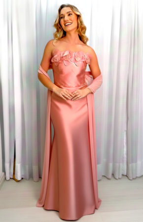 Vestido rosê estilo sereia tomara-que-caia aplicação floral 3D no busto e costas capa leve e translucida