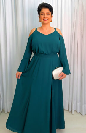 Vestido verde petróleo estilo fluido decote V com alçacinhas e recortes ombro a ombro