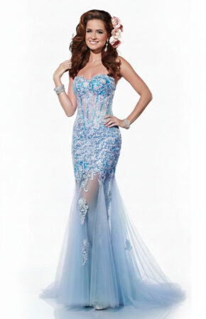 Vestido de festa ou debutante azul serenity sereia tomara que caia com bordados corpete ilusion e saia em tule