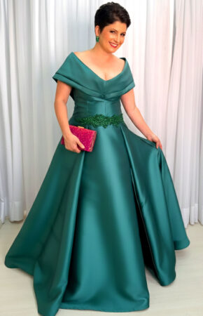 Vestido de festa em zibeline verde esmeralda estilo princesa decote ombro a ombro cintura marcada em pedrarias